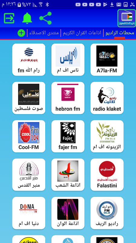 聖クルアーンのラジオ局とアプリケーションのメンバー間のコミュニケーションのためのフォーラムに加えて、すべてのパレスチナのラジオ局が 1 つのアプリケーションにあり、デバイスの大きな領域を占有しない小さなサイズです。既存のラジオ局、パレスチナのラジオ局のいくつかについて言及します。