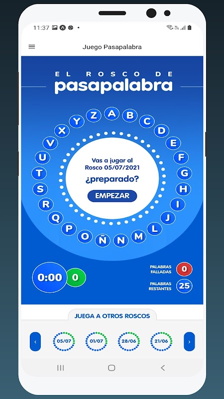 Este Juegos de pasapalabra consisten en preguntas acerca de un tema en particular cuyas respuestas empiezan o contienen cada una de las letras del abecedario. El pasapalabra es un rosco con todas las letras del alfabeto que se irán poniendo rojas o verdes en función de si respondes correctamente o no a las preguntas de cada tema. Pulsa “Saltar” si quieres pasar a la siguiente letra y contestar más adelante. en la parte inferior, puedes elegir juegos con palabras de fechas anteriores. al jugar podrás saber cuantas palabras fallidas llevas y cuantas palabras restantes faltan.