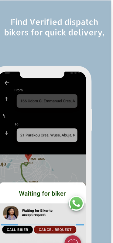 Find Verified dispatch bikers for quick delivery, Get cheapest delivery rates, Search bikers database from wherever you are, Access to thousands of delivery bikes closest to you. Get realtime delivery information of your biker, Pay on pickup, Pay with card using secured payment channels like PAYSTACK, GLOBALPAY & MONNIFY.