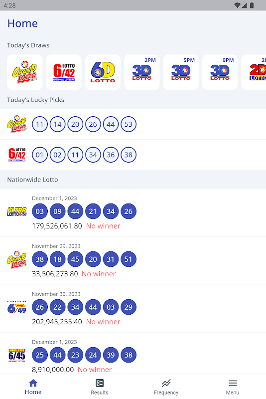 宝くじ売り場に行ったり、ウェブを検索したり、テレビやライブストリームを見たりするために、時間を無駄にする必要はありません。最新の抽選結果をチェックし、過去または以前のロト結果を検索し、頻繁に抽選される番号や人気の番号を見つけ、ラッキーな番号の組み合わせを生成、保存、編集、削除し、ロトの結果履歴と簡単に照合します。
