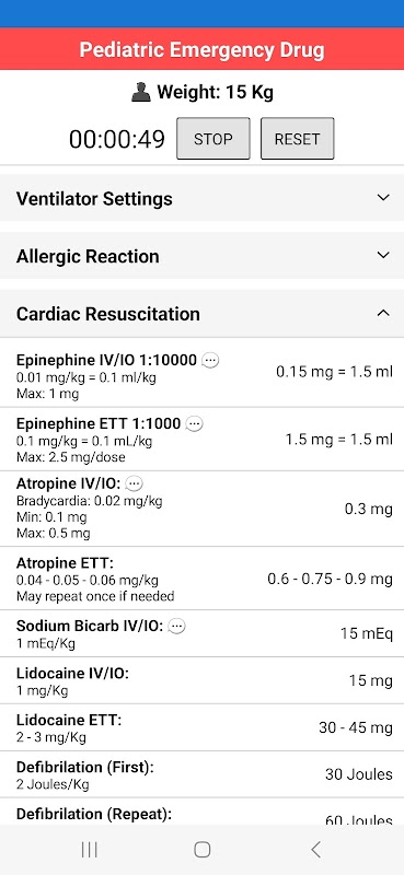 ✔️ 包括的な心臓蘇生データ。蘇生薬、電気的除細動、除細動の具体的な体重ベースの投与量を提供します。
