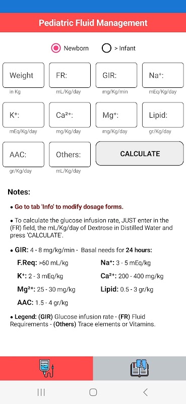 ✔️ ブドウ糖注入速度と毎日の水分必要量を考慮して、新生児非経口栄養に必要な毎日の熱量、電解質、その他の必要量を計算します。