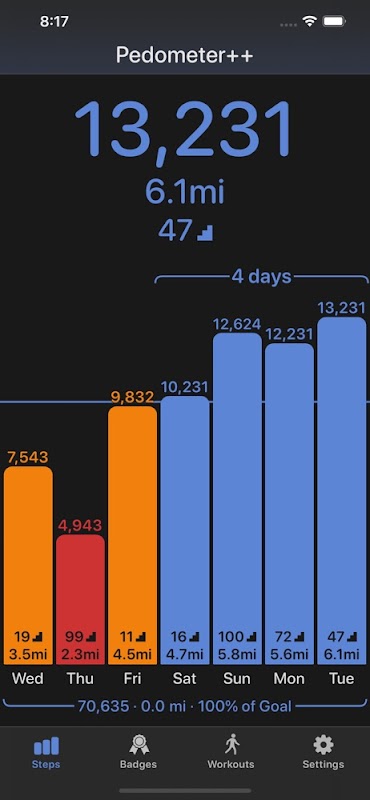 Pedometer++ を使用すると、毎日および毎週の歩数を簡単に追跡できます