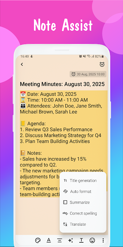 - メモアシスタント:自動整形、要約、スペル修正、翻訳で生産性アップ