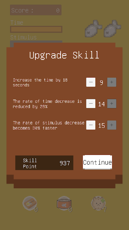 ミニゲーム。制限時間内に猫ちゃんをこっそりとナデナデしてスキルポイントを獲得してアイテムを購入して、高得点を狙いましょう。