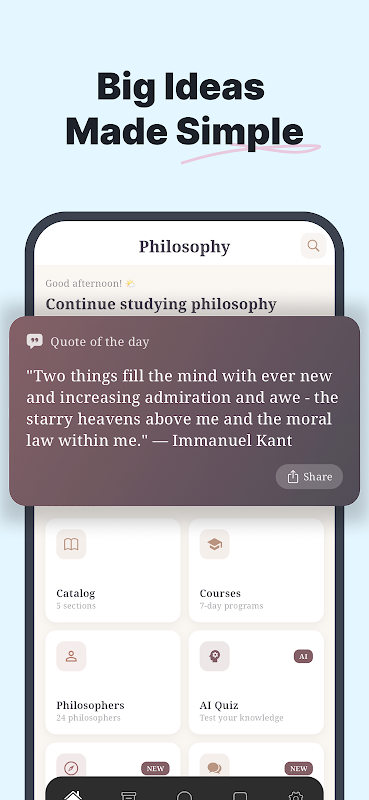 Philosophy: Learn & Explore は、直感的な操作とシームレスな学習体験を実現するように設計されています。明快で分かりやすい言葉遣いが複雑な概念を分かりやすく理解させ、魅力的なマルチメディアコンテンツがあなたを夢中にさせます。