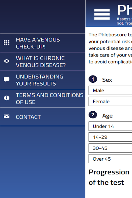 The Phleboscore test is a tool proposed to assess your potential risk of suffering, or not, from chronic venous disease and its progression. It allows you to take care of your venous disease as early as possible to prevent disease progression. The Phleboscore test is a free service provided to medicine by Les Laboratoires Servier. This application is by no means a substitute for a consultation with a physician, who is the only person qualified to establish a diagnosis and provide the appropriate recommendations. This application does not in any way constitute a medical opinion or recommendation, and must not be considered as a diagnostic or therapeutic tool.