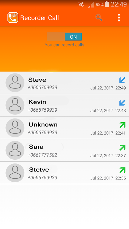 Records Incoming and Outgoing calls in HD Quality, play any recorded call when want to listen it.