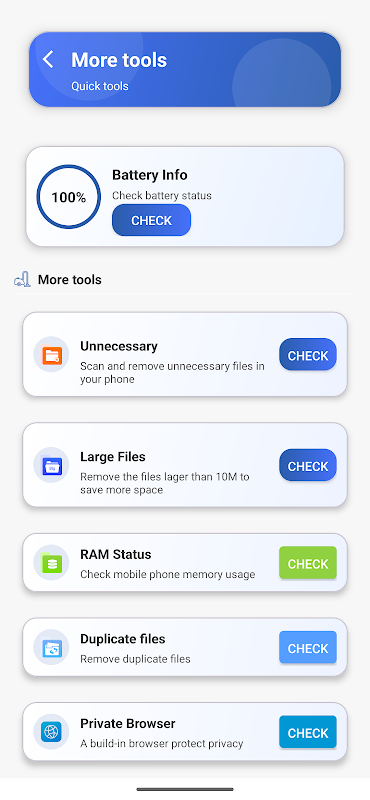Phone Cleanは、高速で集中管理できるツールで、ストレージとパフォーマンスの管理をサポートします。大容量ファイルのクリーンアップ、重複ファイルの削除、ダウンロードとAPKファイルの管理、不要なファイルの検出まで、わずか数タップで行えます。ビジュアルプレビューで、クリーンアップ前に削除内容を確認でき、専用モジュールで各タスクを明確かつ安全に実行できます。