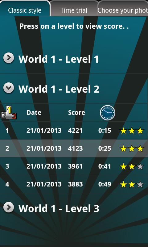 レベル、あなたが得たスコアとあなたの最高の時間に関する情報の完全な統計量、移動回数が終了した後と同様に、このレベルで再生するすべてのゲームのあなたの最悪の時間や平均値を示したことになります。