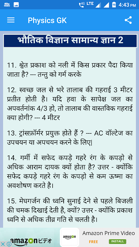 This app contains various general knowledge question and answer in hindi for various competitive examination, This Physics Gk in hindi is very helpful for hindi medium students.