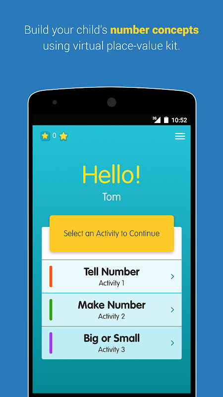 There are three activities. ‘Tell Number’, ‘Make Number’, and ‘Big or Small’. Each of these activities are aimed at strengthening your child’s number concepts by familiarizing them with the place-value based number system.