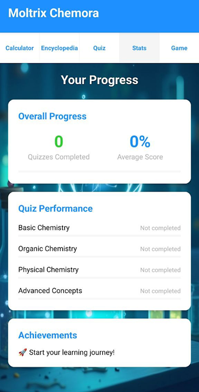 インタラクティブクイズシステムであなたの専門知識を試し、検証しましょう。このシステムは、基礎化学、有機化学、物理化学、そして高度な概念の4つの専門分野で構成されています。各クイズには、即座にフィードバックを提供する、綿密に作成された10問の問題が含まれています。詳細な統計情報であなたの全体的な進捗状況を追跡し、上達に応じて実績をアンロックし、プレイするたびに自信が深まっていくのを感じてください。