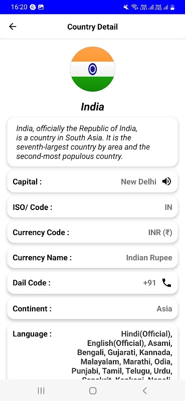 このアプリケーションは、首都、国コード、ISO 国の首都、通貨コード、通貨名、大陸、言語、国旗、国のクイック音声検索、国名の発音などの情報を提供します。