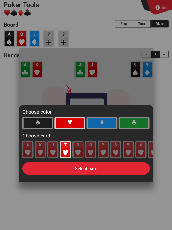 自分のカードと相手のカード、フロップ、ターン、リバー(ある場合)を合計すると、統計情報が表示されます。