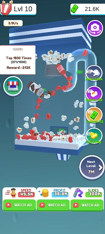 この魅惑的なポップコーンの世界で、あなたは自分だけのポップコーンマシンを手に入れることができます。この魔法のようなマシンは、絶え間なく美味しそうなポップコーンを生み出します。あなたの仕事は、画面をタップして製造プロセスを加速させることです。タップが速いほど、マシンはより多くのポップコーンを生み出します!