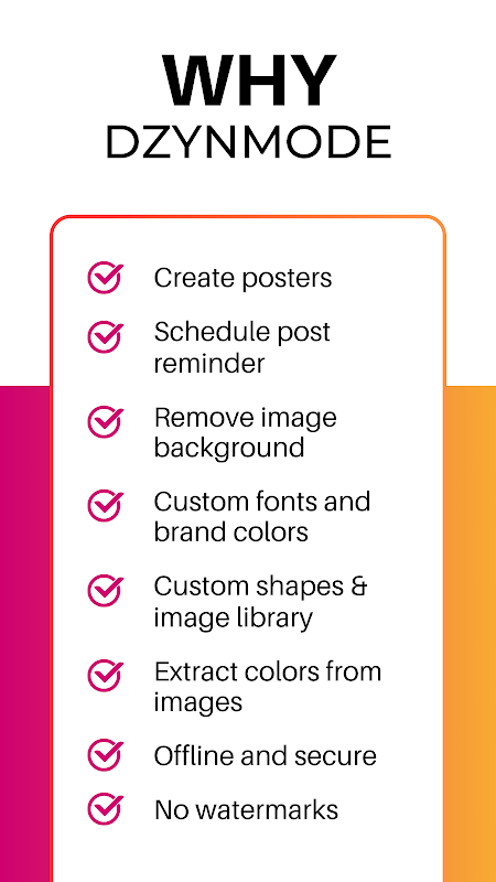 複数のアプリを探すのはもうやめましょう。 DzynMode は、グラフィック デザインのすべてのニーズに対応するワンストップ ソリューションです。見事なソーシャル メディア グラフィックの作成から、投稿のスケジュール設定、データのプライバシー保護に至るまで、DzynMode は、グラフィック デザイン アプリ、デザイン ソフトウェア、ポスター メーカー、チラシ クリエーターなどとして比類のない機能を提供します。