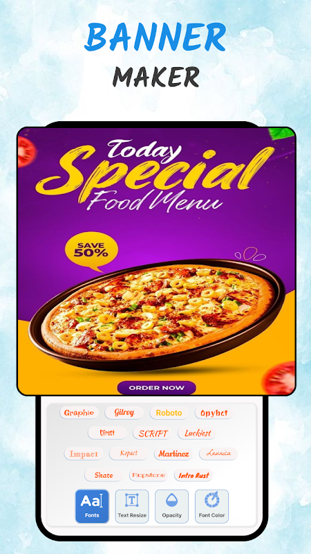 ビジネスチラシ 、 アートメーカー 、および 広告デザインアプリ には、ユーザーフレンドリーなインターフェイス、ドラッグアンドドロップ機能、基本的なテキスト編集ツールがあり、直感的で簡単に使用できるように設計されています。 チラシメーカー アプリケーションは、 インフォグラフィックデザインメーカー の専門知識のレベルに関係なく、目立つ チラシ を作成するのに役立つ理想的なツールです。 フライヤー ポスター の デザイン メーカー アプリ を使用して、カスタマイズ可能なテンプレートでプロ並みのポスター ボードや フライヤー を簡単に作成できます。