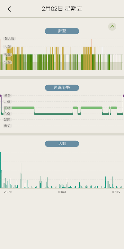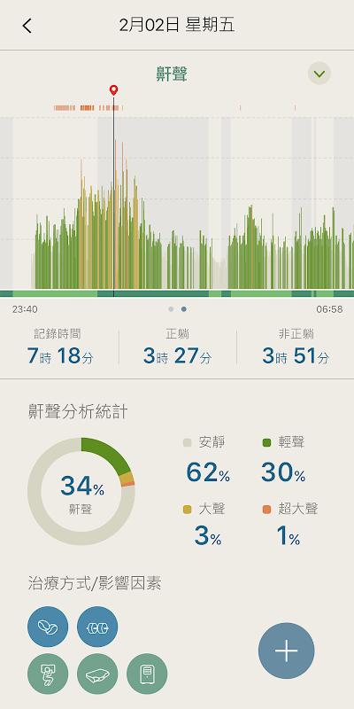 本軟體可透過藍牙與裝置連結,並提供鼾聲及睡眠姿勢的記錄結果。
