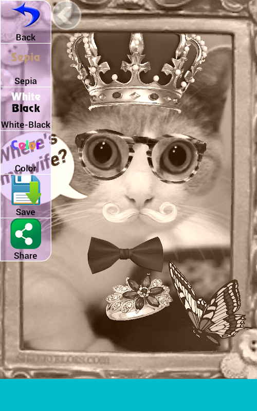 ちょうどあなたの猫の顔の写真をスナップします。そして、クラウン、宝石、衣服、テキストを描画、チャットアイコン、フレームなどがはるかを追加します。