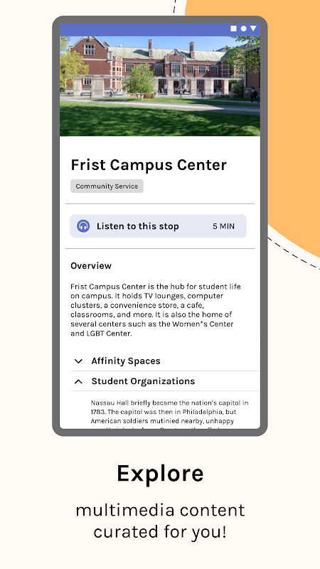 ◦プリンストンのキャンパス、歴史、伝統、学生生活、学者に関するコンテンツを聞いたり読んだりする