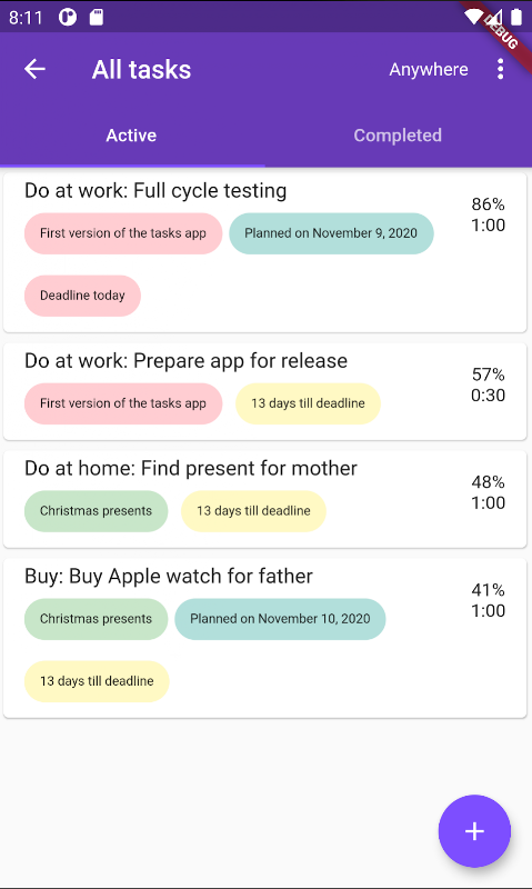 You can easily group your tasks into projects, and projects can be grouped into areas. These dependencies are also automatically calculated in order that single tasks do not form a bottleneck for entire projects or areas.