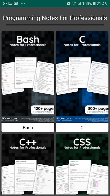 Programming notes for professionals books. This app contains lot of programming languages and other types of languages in PDF file version. Android, Angular 2, Angular JS, Ruby, Ruby on rails, Python, .NET Framework, Spring Framework, C, C#, C++, Bash, PowerShell, SQL, MySQL, MongoDB, Java, JavaScript, Swift, TypeScript, iOS, etc .Lot of guys from Stack Overflow helped for writing this contents.