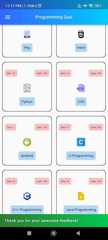 結論として、この無料のプログラミング クイズ アプリをダウンロードすることで、いくつかの一般的なコーディング言語に関する重要な洞察にアクセスできるようになります。今すぐ技術的ノウハウを向上させるだけでなく、後で専門的に進歩することを考えているなら、それは確実な賭けです!もう待たずに、素晴らしいクイズ アプリケーションを今すぐダウンロードしてください。