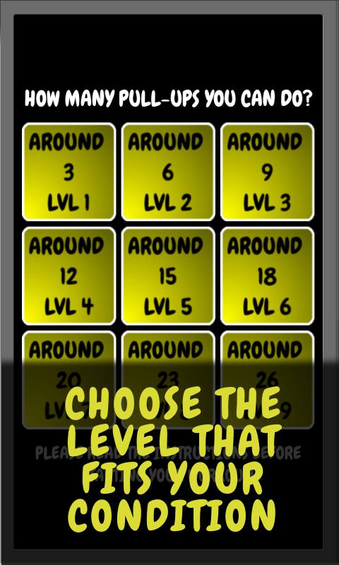 プルアップは、初心者からより高度な訓練への6つの難しさのレベルを持っています。あなたが問題の1つを完了した後は、次のいずれかに移動するには十分な強さでなければなりません。最も困難を完了すると、20のプルアップを介して行うことができる必要があります。