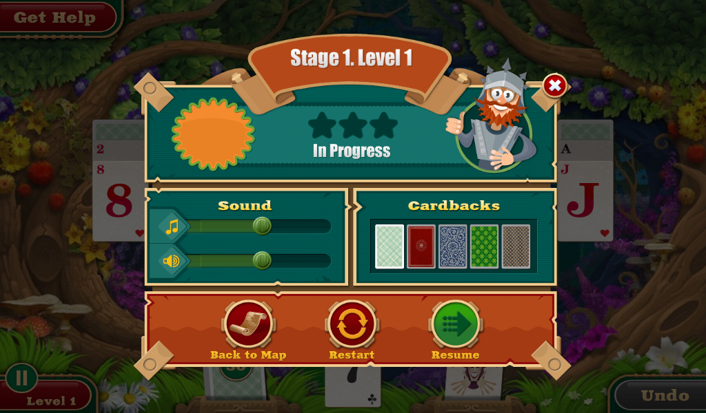 Pyramid Solitaire is a multi-deck solitaire game and great, challenging fun for the intermediate to advanced player. 100 levels provide plenty of gameplay amidst the whimsical woodland scenes. A wily knight is your suited guide through the levels as he provides tips and hints. Piles can be built down regardless of suit, but only groups of cards built down by suit can be moved together. The object is to remove all the cards from play. Customization is available for card motifs and sounds. Excellent table themes and a robust stats card round out this game.
