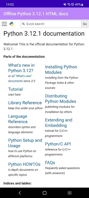 Android OS 用の Python 3.12.1 HTML オフライン ドキュメント。 Python 3.12 の完全な HTML オフライン バージョンがモバイル デバイスで誰でも利用できるようになるところを想像してください。何か問題がございましたら、メールでご連絡ください:[email protected]。