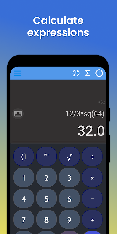 注: 独自のキーボードを使用して式を入力できます。これを行うには、上部のフィールドをタップします。ここには一連のボタンがあります。それぞれのボタンを押すと、一番上のフィールドに記号が追加されます。式を入力した後、= を押すと、結果が下のフィールドに表示され、それにほぼ等しい値が上のフィールドに表示されます。