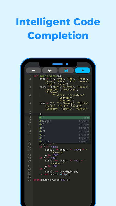 Python IDE を使用して、モバイル デバイス上で Python をコーディングする能力を体験してください。この高速アプリは、優れた効率で正確な結果を提供します。洗練された直感的なユーザー インターフェイスにより、昼夜を問わずシームレスなコーディング エクスペリエンスが保証されます。