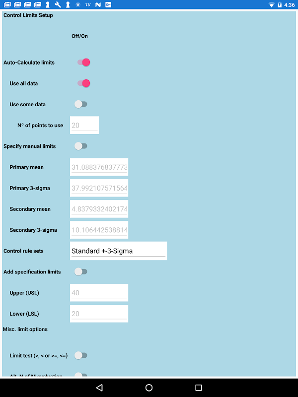 ユーザーは、組み込みのセットアップフォームを使用してSPCチャートと制御限界をカスタマイズすることができます。自動計算し、手動で設定された制御限界の両方がサポートされています。ユーザは、手動で入力および編集プログラム内からのサンプルデータをすることができます。また、ユーザは、CSV(コンマ区切り値)ファイルからサンプルデータをインポートすることができます。彼らはあなたがアプリを使う次回簡単にアクセスできるように、グラフ全体のセットアップ、およびデータは、ホストデバイス上に保存することができます。あなたも、アプリの次回起動時自動ロードされる現在の設定を設定することができます。