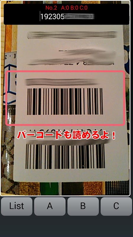 一番上のリストに、これまで読み込んだバーコードの総数、および、それぞれのコードでカウントしたA,B,Cのそれぞれ