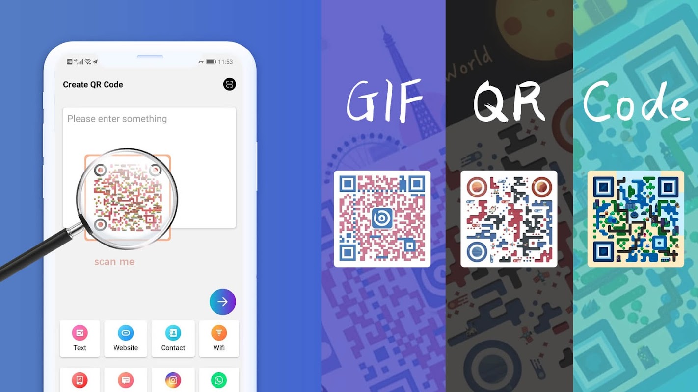 Generate your QR Code with many cute and fashionable templates, select GIF pictures as QR background. New QR templates update weekly, just download templates from this app, and input text, website link, Facebook page, this app will make the most beautiful QR Code for you.