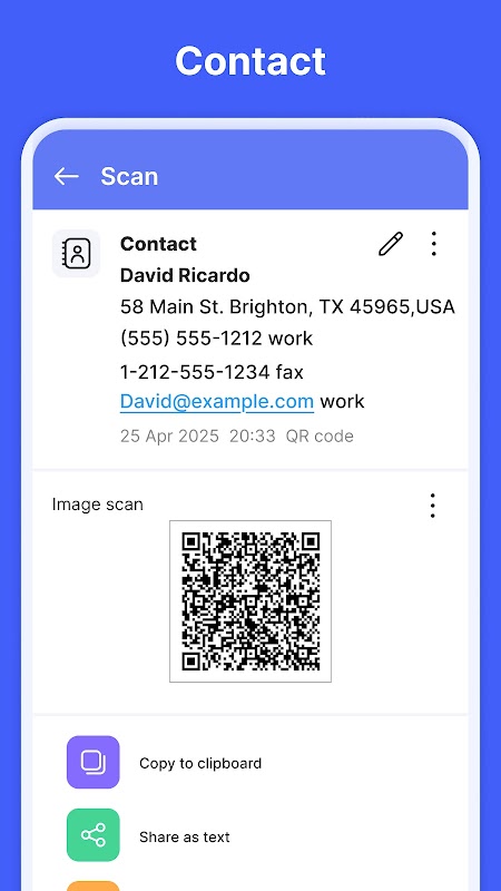 - シームレスな共有:スキャンしたデータや新しく作成したQRコードを、メール、メッセージ、ソーシャルメディア、その他のアプリで共有できます。