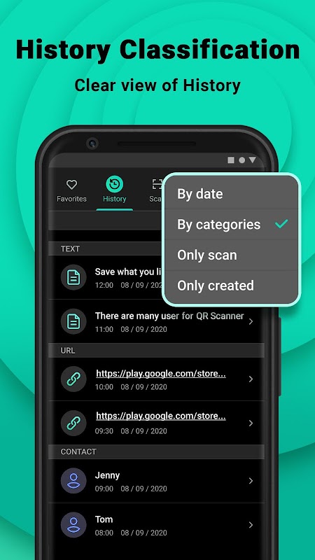 すべての履歴レコードを「日付別」、「カテゴリ別」、「スキャンのみ」、「作成のみ」で明確に表示します。 時間やQRコードタイプで並べ替えたり、スキャンしたアイテムや作成したアイテムを表示したりできます。