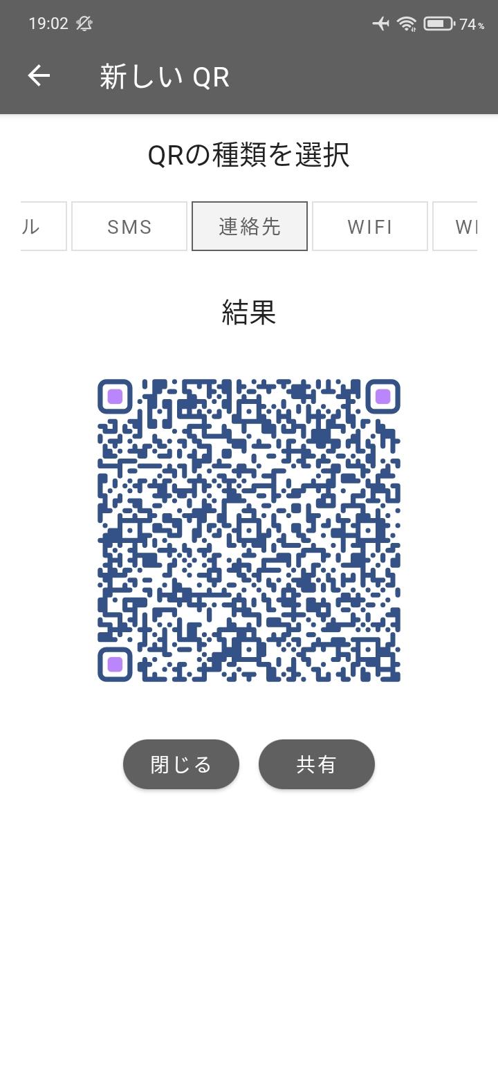 アプリケーションは QR コードを生成できます。 テキスト、URL、連絡先、電話、SMS、WiFi、WhatsApp メッセージなどの既製のソリューションを使用して、独自の QR を簡単に作成できます。完成した結果は制限なく共有できます。