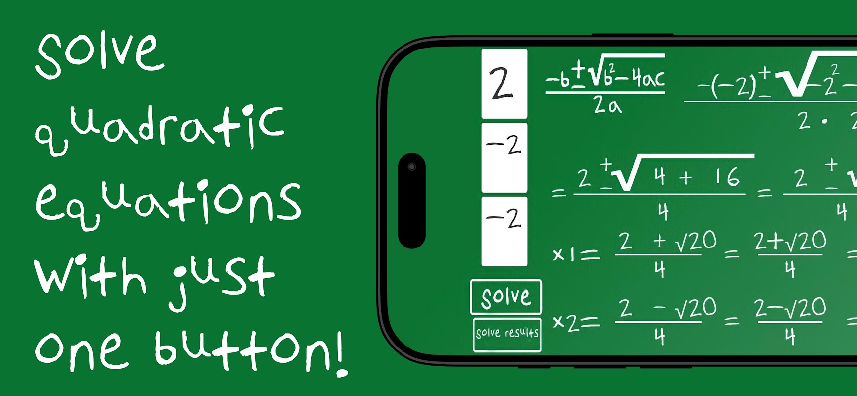 二次方程式を楽々と解きます!二次方程式を素早く簡単に解く必要がありますか?この強力な計算機がその答えです!係数「a」、「b」、「c」を入力し、1 回タップするだけで、実根と複素根の両方が、明確なステップバイステップの解とともに得られます。主な機能: -ワンタップソリューション:ボタン 1 つで二次方程式を即座に解きます。 -ステップバイステップのブレイクダウン:解に至る詳細な手順でプロセスを理解できます。 -すべてのケースに対応:2 つの根、1 つの根、または実根のない方程式を正確に解きます。 -小数と負数をサポート:任意の小数または負の実数を入力できます。 -有理数と無理数の解答:必要な形式で正確な結果を取得できます。学生、教育者、および信頼性の高い二次方程式ソルバーを必要とするすべての人に最適です。今すぐダウンロードして、数学を簡素化しましょう!