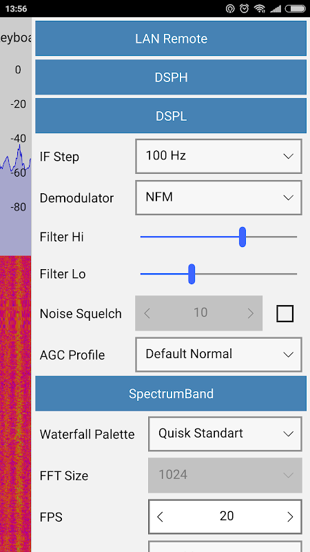 - Many spectrum settings (FFT size, waterfall FPS and color theme)