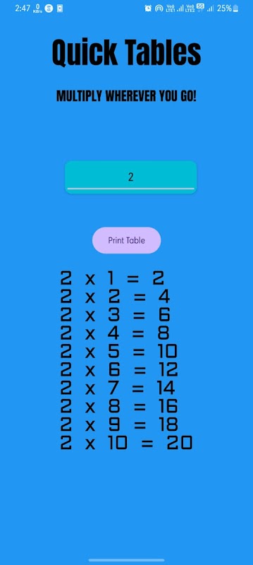 Quick Tables は、シンプルかつ強力な九九アプリで、誰でも簡単に楽しく掛け算を学習し習得できるように設計されています。学生、保護者、教師のいずれであっても、このアプリは、迅速かつ正確な掛け算の計算を行うための完璧なパートナーです。数字を入力し、「表の印刷」ボタンをタップするだけで、魔法が起こるのを見てください。Quick Tables が完全な九九を瞬時に生成します。