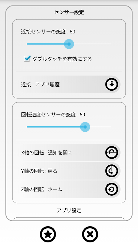 このアプリは、センサーで「Androidのシステム機能」を発動させるアプリです。