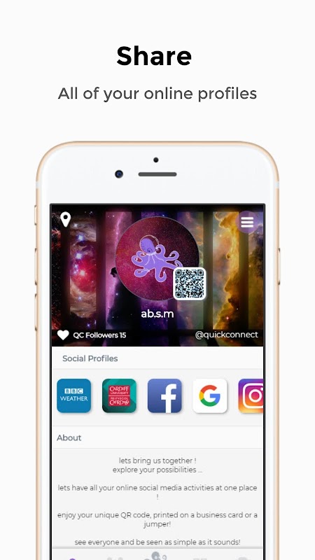 QuicklyConnect (QC) is the home for all your social media applications, QC allows you to display your online profiles at the touch of your finger tips on your smart phone or laptop. We understand that social media has become the basis of businesses and personal usage, whether it is to promote a business or to connect with your family and friend’s QC allows this by storing your online profile with a Smart QR code. Let’s connect all your online platforms on one centralised application the QC way.