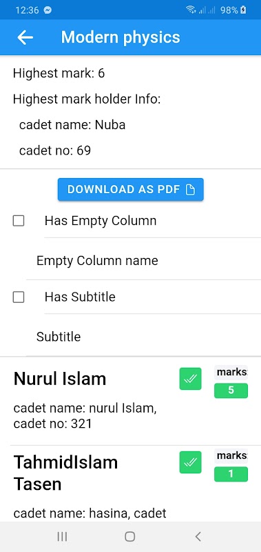 5/ Responses of quiz can be downloaded in table format as pdf sorted by roll number with nice statistics. (for example: percentage, highest mark holder) also with a custom column if you want.