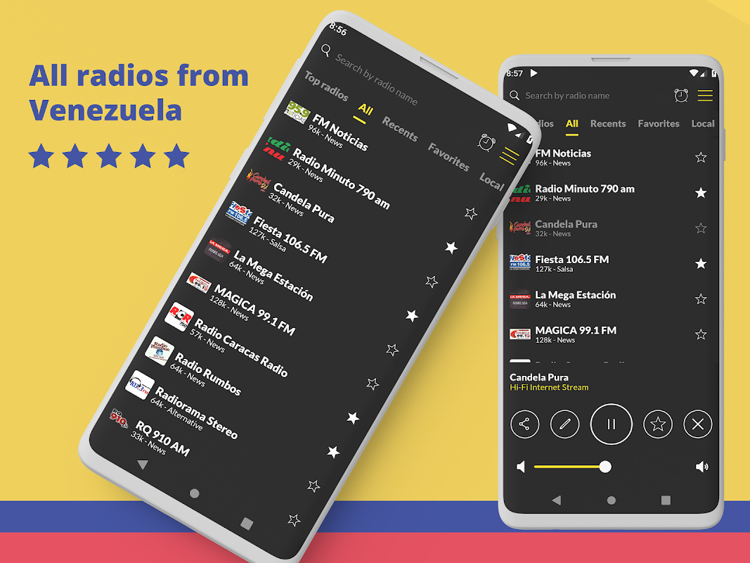 ラジオベネズエラでNoticias, Romance 93.1, Rumba e Salsa, Union 90.3 Caracas, Rumbera, Fiesta Latina 106.1, Musica Llanera, La Romantica 88.9, Recuerdos 1300, Planeta 105.3, Rumbos, Candela Pura, Sabrosa 90.1, Minuto 790, Sabor Latino HDのようなすべてのお気に入りのラジオ局のストリーミングを聞いて、私たちの提案のおかげで他の多くのラジオを発見してください!