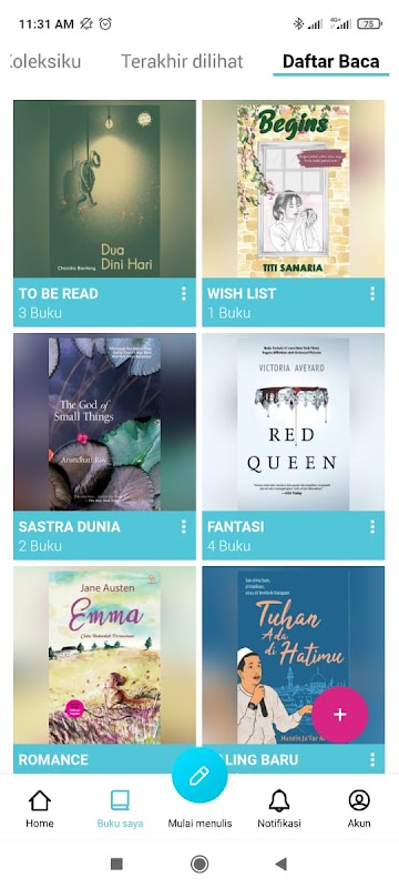 Rakata では、Mizan グループの出版社 (Mizan Pustaka、Noura、Bentang Pustaka) からの質の高い書籍、他のユーザーからの無料の小説、Rakata 作家のオリジナル ストーリーを読むことができます。