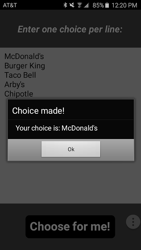 Can't decide what restaurant to go to? Arguing over which movie to watch? Use this simple app to help you make decisions. You can enter as many options as you want and hit the "Choose for me!" button to get a completely random selection from your list.