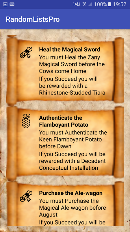 Choose what type of list (Names, Places, Quests, Treasures, Personality Traits, or even Desserts!) and you will be presented with a Random List!