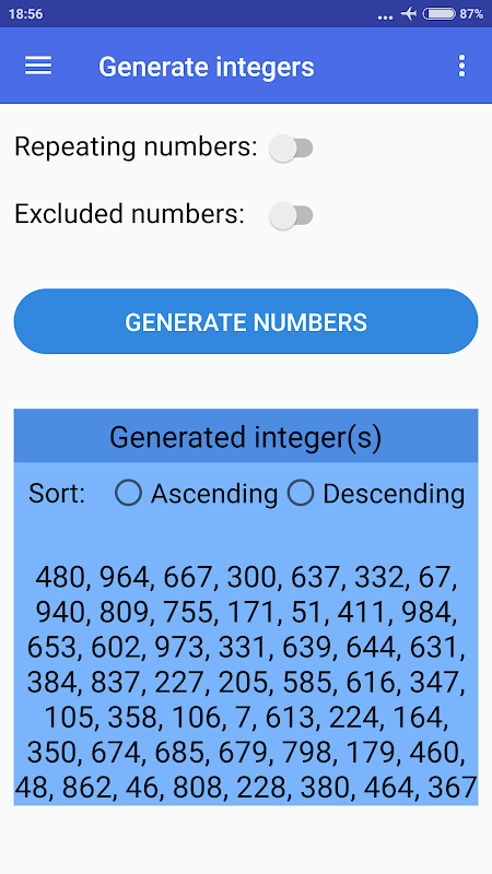 また、特定の数値を除外するかどうか、乱数を繰り返すかどうかを決定し、結果を昇順または降順で並べ替えることもできます(デフォルトの順序はランダムです)。